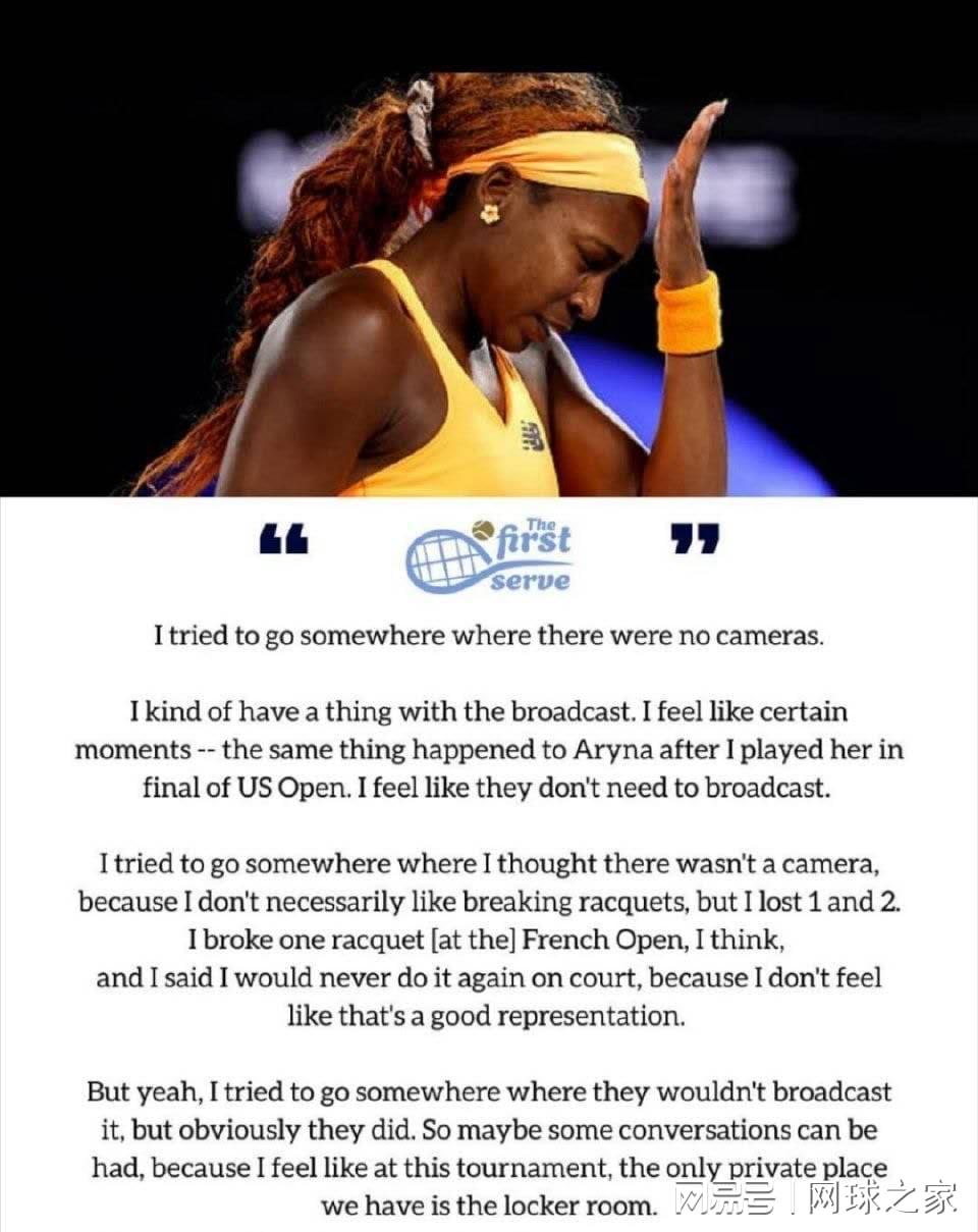 这一创举的直接导火索,来自上个月澳网发生的一幕。当时,美国名将高芙在女单八强被爆冷出局后,强忍怒火回到球员通道怒摔球拍,画面却被大会镜头捕捉并直播,引发了关于球员隐私的广泛争议 。包括斯瓦泰克、德约科维奇在内的多位网坛巨星都曾公开呼吁,希望外界尊重球员场外的生活空间,不被打扰 。